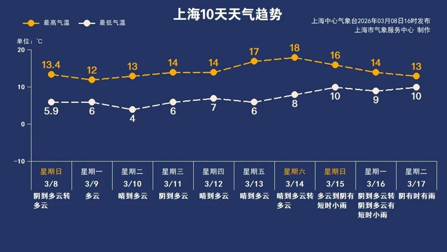 上海中心气象台预报,周一(3月9日)受冷空气扩散影响,云量较多,但阳光仍有机会露脸,最高气温12℃。周二早晨,气温将降至近期低点,市区最低仅4℃,郊区更低一些。周中开始,阳光逐渐饱满,推动气温一路走高,预计周后期最高可达17℃至18℃,春意融融的感觉扑面而来。